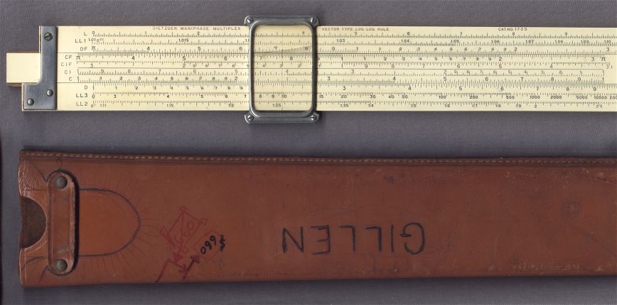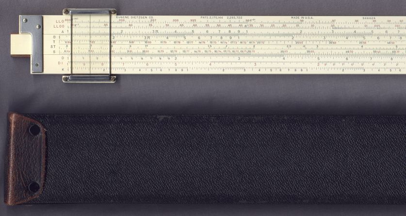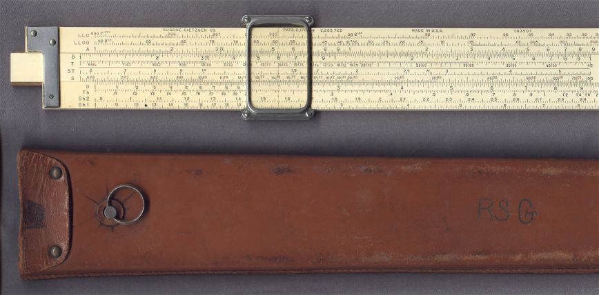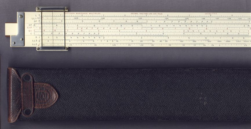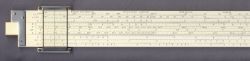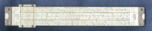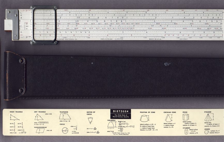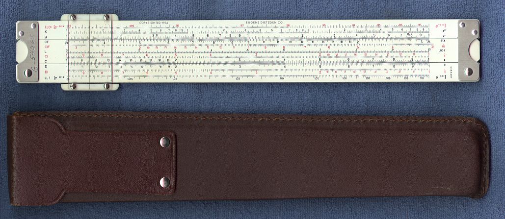 An older version of one of Dietzgen's top of the line slide rules. This rule has a few nice adaptions, like the slightly worn down edges of the celluloid on the griping regions of the slider (hard to see on the scans). This particular rule also features Dietzgen's frameless cursor design, and has a cursor patent date of 1946. Frameless designs were always more prone to breaking, and so relatively few survive intact to this day. They also weren't made for very long ... certainly by the early 50's they had switched to the more substantial all-metal designs. The case is virtually identical to the K&E models of the same era, with a hard black textured particle board body and leather closing flaps bolted on. First one I've ever seen for a Dietzgen rule, though. Overall, the condition of the rule is excellent ... a very nice example of a hard to find model.