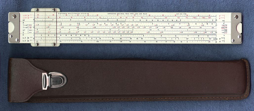 One Dietzgen's best rules, still in incredible condition! Dietzgen's high end rules are frequently compared to that other major U.S. slide rule maker, K&E, which had very similar offerings. This model in fact is very close in design to the top of line K&E N4081-3, with the addition of an inverted DI scale on the reverse side. Like that later model K&E, this Decimal Trig Log Log rule also features relieved wood edges, though without the labelled celluloid laminate strip the K&E models sport. In fact even their cases are almost identical, featuring black leather bolted on to a hard cardboard base. The patina of this rule remains exceptionally white, and the wood seems to be mahogany (typical in K&E rules, but Dietzgen seemed to use a variety of materials, as shown below). This rule also features an all metal cursor arrangement, and has a more substantial feel than the K&E rules, although it does seem a bit dated in style. Judging from the various patent dates, this rule probably stems from the mid to late 50's, like the equivalent K&E model. Also included with this rule is one of Dietzgen's laminated inserts featuring a slide rule conversion table and trig sheet cheat, as shown in the high resolution scans. Clearly one of Dietzgen's best rules ... although I must admit I'm still partial to my favourite K&E N4081.