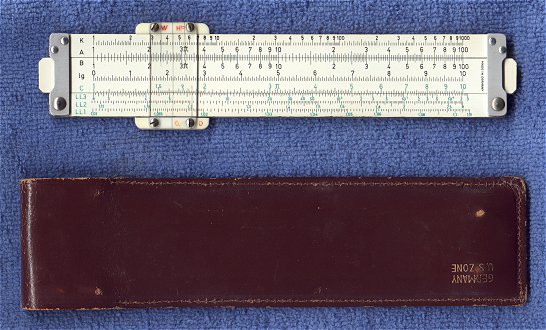 Another example of an all-aluminum Dietzgen rule, undoubtedly made by Ecobra. This pocket slide rule is very similar in size and shape to my Ecobra 1461, although here with a duplex cursor assembly. This rule also has a lot of nice extras, like the oversized slider, multi-colour scales, Pythagorean scale, and multiple hair-line cursor. Can't figure out why they didn't include that last feature on the 1738 above. The case is virtually identical in design to my Ecobra 1461, although this one is a stained a darker colour and has the name "Dietzgen" stamped on the front and "Germany, U.S. Zone" on the back, helping to date this rule to just after the Second World War. Probably one of the first Ecobra rules Dietzgen ever started carrying (see my Misc page for a discussion of a Ecobra's relationship with Dietzgen). A very nice and useful pocket model rule.