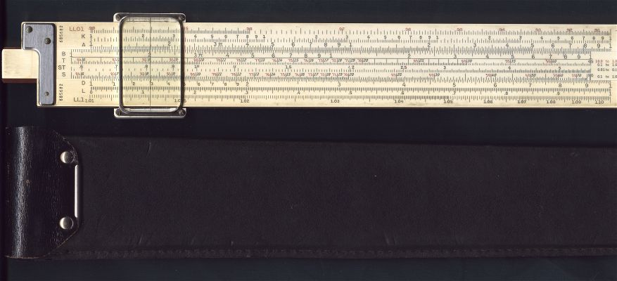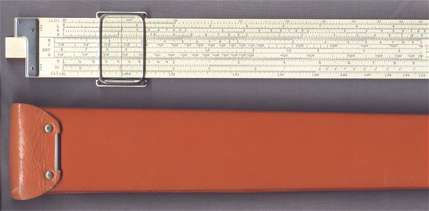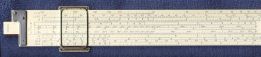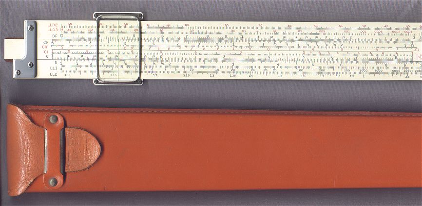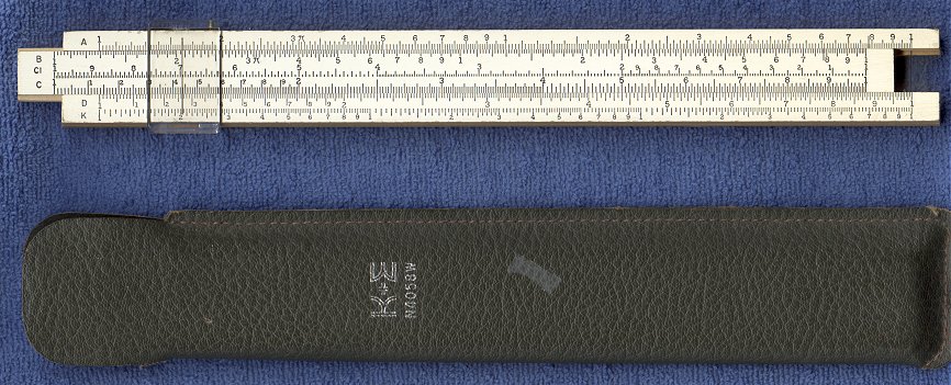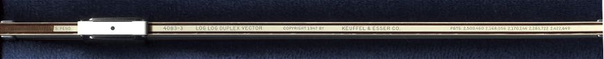 An older version of K&E's high end duplex style vector rule, and a very interesting specimen! This rule clearly dates to 1935 on the basis of its serial number, but you'll notice the more modern cursor assembly. This improved cursor style is generally believed to have been introduced in 1936, according to entries in the K&E catalogs. And the vast majority of cursors contain a 1937 patent date printed on the end pieces ... but this is the second time I've managed to find one that simply says "patent pending" (the other is on my 4053-3 page, and that rule dates to 1934). This suggests to me that K&E actually released this cursor a couple of years earlier than 1936, but I'm not sure as yet to the dates. In terms of scale arrangement, notice the slightly reduced number of scales compared to the later 4083-3 (also a vector rule), and the inclusion of the identification labels on the back of the rule. Otherwise, not much changed from this immediate precursor ... even the name stayed the same (K&E Log Log Decitrig on the closing flap). The case is the standard high end leather case with chamois interior, but with one little oddity - it actually still has the belt attachment on the back! Would you believe that this is the K&E first rule I've come across that actually still has it? Rather hard to find. The rule and case are also both in very good condition ... a fascinating specimen, and a nice addition to the my K&E family.