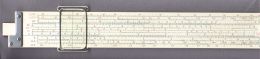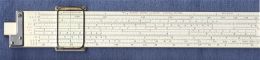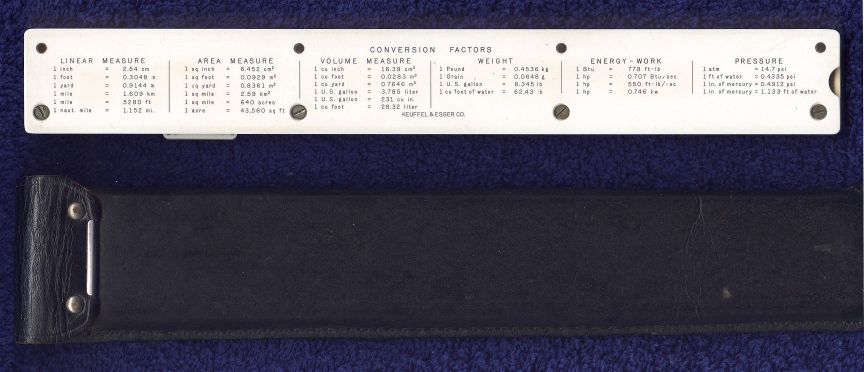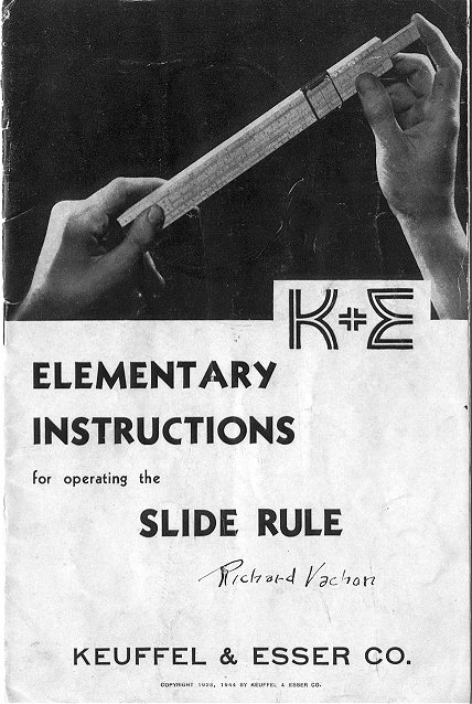 The 4058W was K&E's most basic offering. In fact, this was their "Beginners" model, and it was the most simply (and cheaply) made of any K&E rule. Like the more advanced 4053 series, this model also goes back a long way and underwent a number of design modifications over the years. This representative example from my collection is a fairly late model built, with an all-plastic spring-mounted cursor and mid-century table of equivalents on the back. Made apparently of light-weight pressed wood, this model has a simple white-painted face with printed monotone scales, very reminiscent of the inexpensive Lawrence Engineering rules. Unlike all other K&E rules, this model lacks parts/serial numbers, consistent with its basic design features. I've seen various types of paperboard/vinyl sleeves to protect the rule, and a decent enough model is shown in the high resolution scans. Judging from K&E's price list, this model rule would have retailed for $2.25 US in the early 1950's. I've also included a scan of a manual for this model rule, taken from the same time period (final copyright date 1944). This Beginners rule is just that ... basic, functional, with no pretension to being anything more.