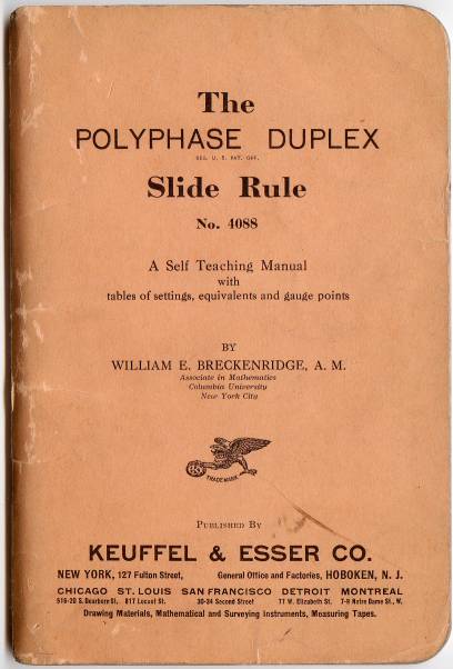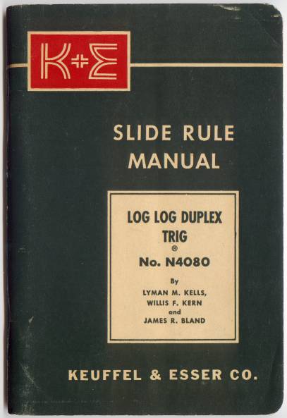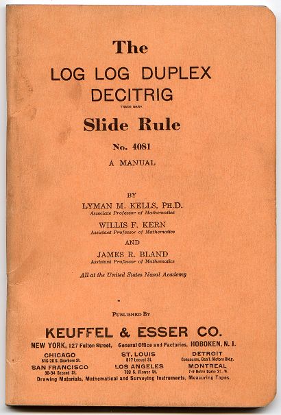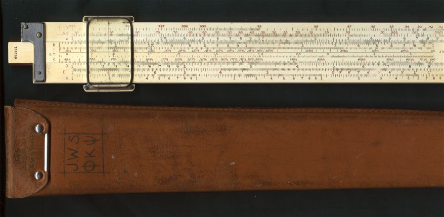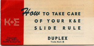 Another version of this classic slide rule ... it's interesting to see how quickly it started to change. In principle the same as the preceding model on this page, but with a couple of interesting differences. On the body of the rule, the LL0 and LL00 scales are now in red instead of black, and reversed in relative position. All the other scales and the K&E labels and patent dates have stayed the same. The manual is in excellent condition, with the pages still very white. This particular rule also features the high-end K&E all-leather orange coloured case with chamois-like interior. In fact, the "S" in the title refers to the label on the case, and presumably reflects the "stitched" all-leather case design. A nice rule that was obviously highly prized, as the name of the original owner (one James W. Smith) is imprinted in gold lettering on both the case and the rule. Looks like he got a lot of use out of it too!