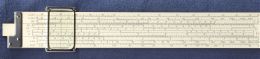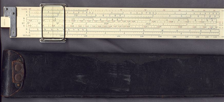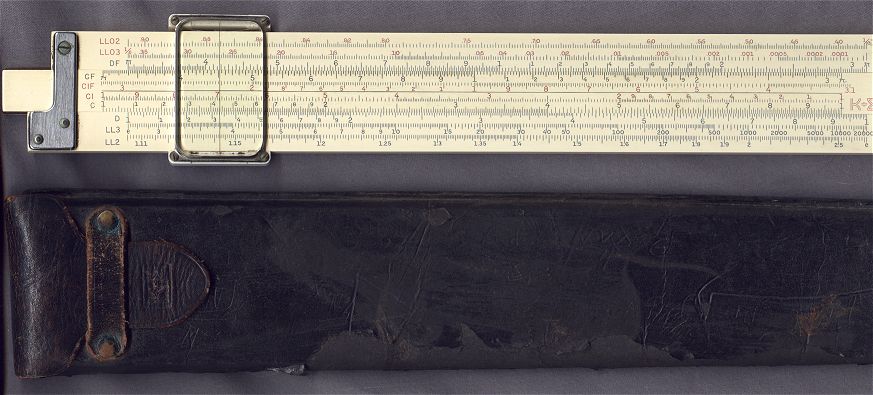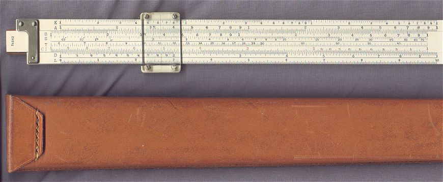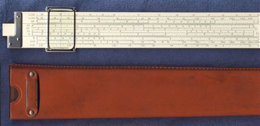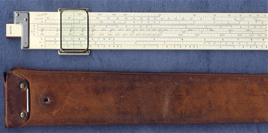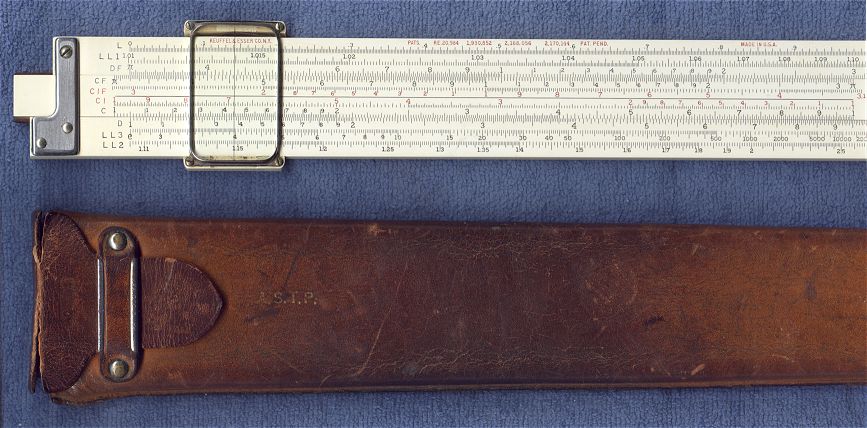 Not much changed on this model in the early 40's ... except, oddly enough, the patent numbers! This rule, and others I've seen from the same time period, have additional late 30's patent numbers on the face. Otherwise, they are not appreciably different from the one shown immediately above. The leather case for this rule is also the high quality leather type, and it has aged to a nicely satisfying rich brown colour. Like with many high end slide rules, this particular rule seems to have gone through a number of owners, given the different name engraved on the rule and and the various ones imprinted or written in ink on the case. Overall, a well worn specimen of this rule ...
