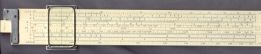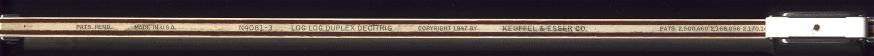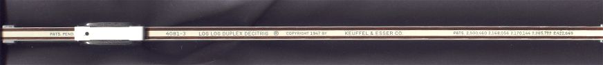 All the later-build high-end duplex rules like this one also feature a revised cursor assembly that seems to have resolved the KERCS problem (K&E Rotting Cursor Syndrome) that affected many of the older model duplex rules. The new cursor end pieces are made out of a different sort of plastic that appears to be very resistant to age-related breakdown, and have remained ivory-white to this day. The K&E label and patent numbers are hard to see on these later-model cursors, as they are on the face pieces that are partially obscured by the metal frame. One little oddity about this particular rule: when I received it, I noticed that one of the pieces of cursor glass was actually a prosthetic replacement! Shown in its own scan, it appears to be a piece of Plexiglass crudely cut to fit the cursor frame. It also has two replacement hairlines etched in it - presumably the creator realized he had miscalculated once he had assembled his makeshift apparatus, and so etched a second line that accurately translated the cursor mark from the intact side. In any case, I've replaced it with an extra original 4081 cursor glass I had available ... good as new now. The manual that came with the rule has a final copyright date of 1948, so that is also consistent with the estimated age of this specimen. The case is the standard form-fitting cardboard type with leather closing flaps bolted on, although this particular specimen is in pretty bad shape. Please check out the remaining rules on this page for a detailed comparison.