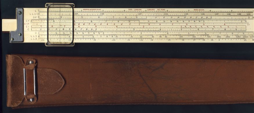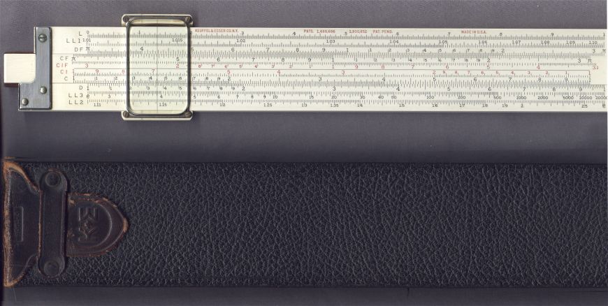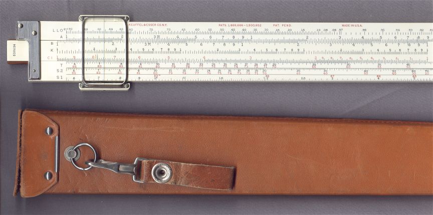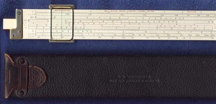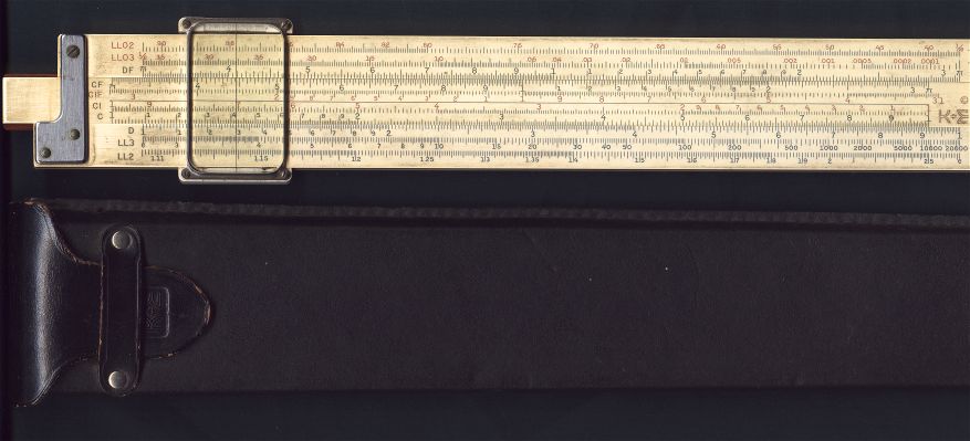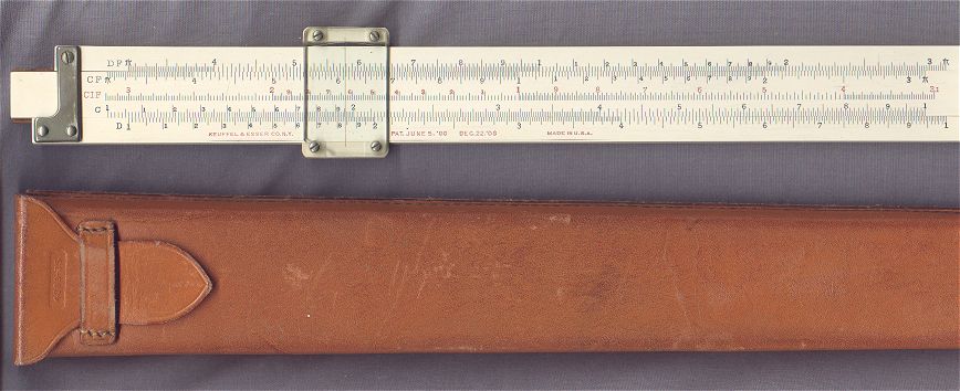 Probably my favourite slide rule manufacturer, K&E was the dominant slide rule maker in the US. They also made a large range of drafting and related products, and even had offices here in Montreal. Their rules featured mahogany cores with celluloid facings, and have one of the nicest "feels" among slide rules, if you know what I mean. My personal favourite (and considered one of the top three among collectors) is the K&E 4081 series with the exposed mahogany wood along the edges. Their high quality leather cases are also among the best, and were frequently imitated. Over the course of production, they carried an extensive range of slide rule models, although they frequently changed their model numbering schemes in the last couple of decades of slide rule production, confusing matters considerably for collectors. They eventually switched to all-plastic models, but continued their tradition for innovation in layout and scale design right up to the bitter end. Unfortunately they didn't survive intact, but their final assets were eventually acquired by the reproduction paper and film company Azon, which also bought out what was left of the Frederick Post and Hughes Owens companies. Where available, I've listed model variants in chronological order on this page. Please note that some of the estimated dates have undergone recent revision, thanks to Clark McCoy's excellent reference set of various K&E catalogs. Additional dating information has been obtained from a variety of sources, with special thanks to Ed Chamberlain for his excellent set of K&E dating curves based on K&E serial numbers.