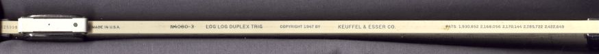The various 408x models are considered to be K&E's premiere slide rules. Made of celluloid on mahogany, they feature an excellent and extensive scale arrangement. As one fellow enthusiast noted, Pickett's may have gone to the moon, but these are the slide rules that probably built the bomb! The N designation ("New") was adopted in 1949 for this series of rules, and presumably reflects the major scale and label change at that time. However, K&E was not consistent in its use this label, and eventually dropped it on the 408x series around 1954. I'd estimate the age of this particular rule to 1950, based on Ed Chamberlain's reference set of dating curves for K&E serial numbers. The first difference you'll notice is that all of the rule's descriptive product information and bona fides on listed the edge instead of the face, as was standard on earlier model rules. You'll also notice that this model lacks the gorgeous relieved wood edges of later N specimens (earliest example I have with the inlaid wood is 1951). The only specific difference between the 4080-3 and 4081-3 series that I can see is in the trig scale arrangement (the 4081-3 is a decitrig).