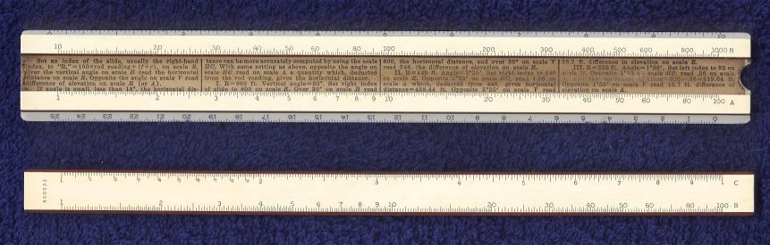 The 4100, also known as a Stadia rule, is a specialized surveyor's slide rule. The rule has the standard late model Mannheim body, similar to the last incarnation of my 4053-3 series. It features R, H, HC, V, and A scales on the face, with a B and C scales on the reverse of the slider, and inch and centimeter rulers along the edges. In case you're wondering what all those scales do, no problem - there's an explanation on how to use them inside the slide rule behind the slider! Basically, they refer to horizontal (H, HC) and vertical (V) distance, as well as elevation (A, B, R) ... everything the average surveyor would need to know. The back of the rule has the standard conversion factors. Interestingly, the face of the rule has yellowed considerably with age, whereas the solid plastic base remains ivory-white. Clearly K&E used a difference type of celluloid base for these two materials. The case is the standard form-fitting black cardboard type with leather closing flaps bolted on. A interesting (and rare) special purpose rule ... and obviously highly prized by collectors, given the insane amounts of money I've seen shelled out for these things on eBay!